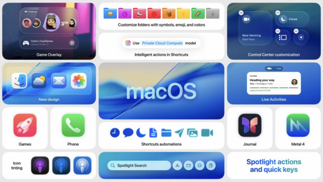 أعلنت أبل عن نظام macOS Tahoe 26، بنفس تصميم “الزجاج السائل”، مع تحسينات في تقنية “آبل إنتليجنس” وميزات “الاستمرارية” التي تربط بين الماك والآي-فون بشكل أفضل.