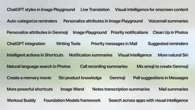 وأعلنت أبل عن تحديثات لـ Image Playground وGenmoji، حيث أصبح بإمكان المستخدمين إنشاء صور باستخدام ChatGPT مباشرة في Image Playground مع أنماط جديدة مثل الرسم الزيتي، الفيكتور، الأنيمي، والطباعة، والألوان المائية، بالإضافة إلى توفير واجهة برمجية (API) للمطورين.