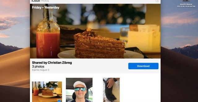 يؤدي الوصول إلى رابط في متصفح سطح المكتب إلى فتح صفحة تنزيل مصممة بشكل جيد على iCloud.com بنفس شبكة الصور المصغرة مثل صفحة المعاينة في الصور. وتتم مشاركة الوسائط مع مواصفات الصورة بالكامل أو ما يعرف ببيانات EXIF الكاملة، بما في ذلك طراز الكاميرا والموقع.