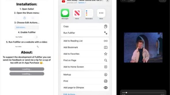 تطبيق خفيف الحجم يقوم بإضافة دعم تشغيل مقاطع الفيديو بشاشة كاملة على متصفح سفاري. عند فتح موقع ويكون هناك فيديو بعض المواقع لا تدعم مشغل آبل للفيديوهات بشاشة كبيرة وعند تشغيلها لا يمكنك تكبير الفيديو لمشاهدتها أو استخدام ميزة صورة داخل صورة، هذا التطبيق سيحل الأمر كل ماعليك فعله من سفاري اضغط زر مشاركة الرابط واختيار التطبيق من قائمة المشاركة لفتح الفيديو بشاشة كاملة على الآيفون.